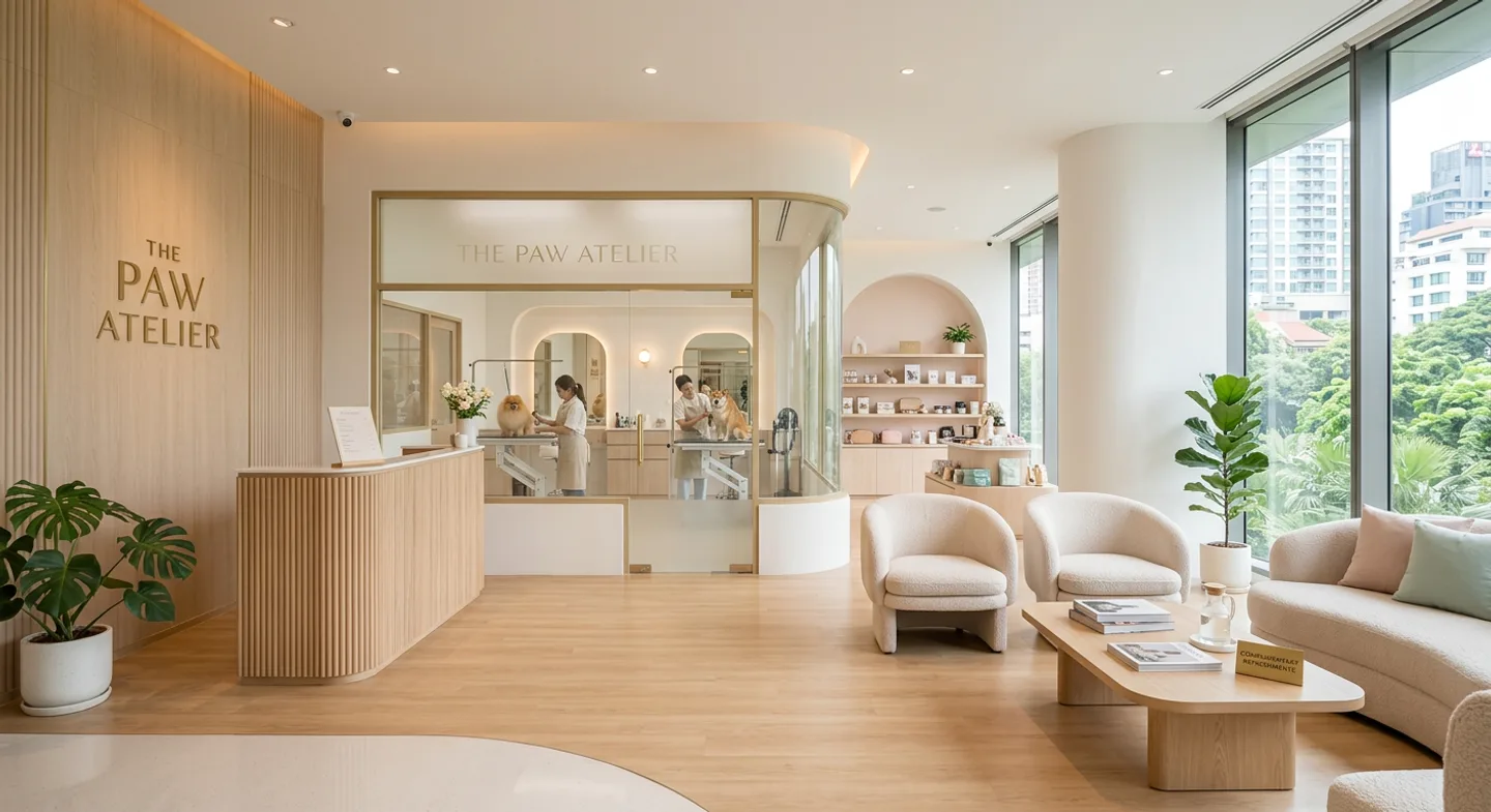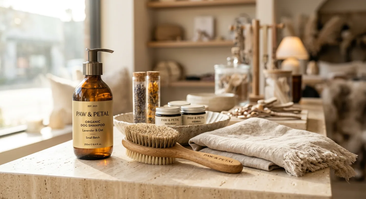 Warm, trust-forward landing for boutique groomers with care focus and organic product showcase.